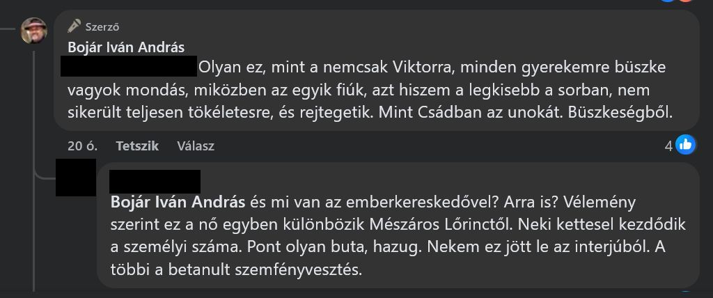 A következő hozzászólások még a szalonképesebb kommentek táborából származnak, Bojár és Hadházy oldalai mellett többek között egy tiszás közösségi csoportból, de válogattunk Nyerges Csenge influenszer, a Patrióta, illetve kollégánk, Szilvay Gergely Facebook-oldaláról is.