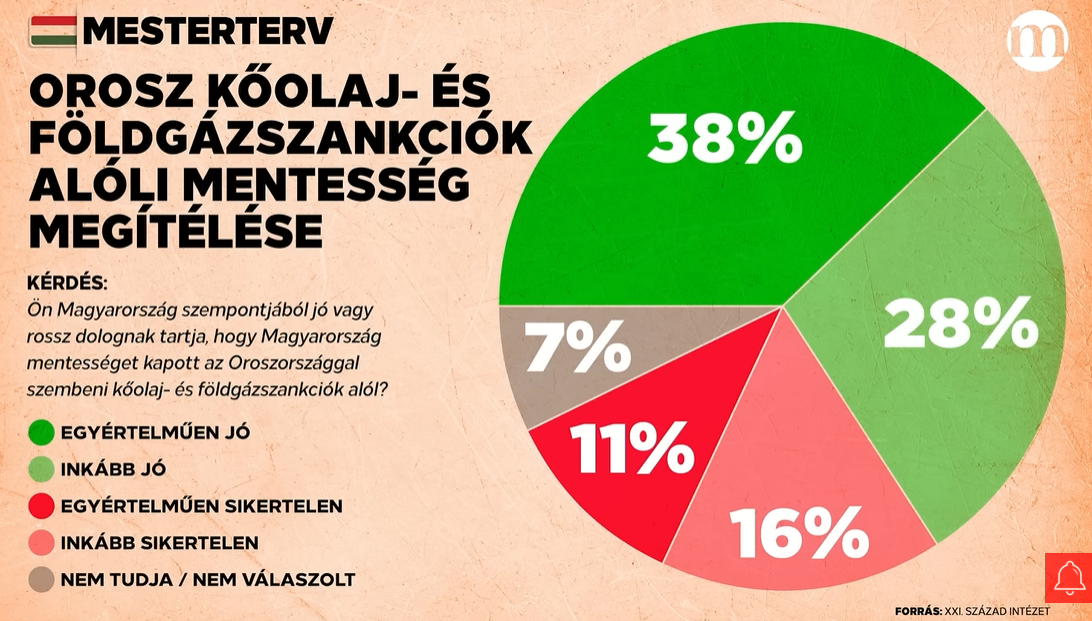 Ezután következett a szankciók alóli mentesség megítélése, melyet szintén a XXI. Század Intézet tett közzé. G. Fodor rámutatott, hogy a válaszadók kétharmada sikernek tekinti, hogy menetességet kaptunk az orosz energiahordozók behozatala alól. „Itt is látszik, hogy amikor a miniszterelnök nagypolitikát csinál, akkor kispolitikát is csinál. Tehát, aminek leér a lába” – fogalmazott az elemző. Aláhúzta, hogy ez a megállapodás komoly előrelépés, mert ha ez nincs, akkor decembertől háromszor annyit fizetünk a rezsiért és a tankolásért. „Ez tényleg a zsebünkre megy” –