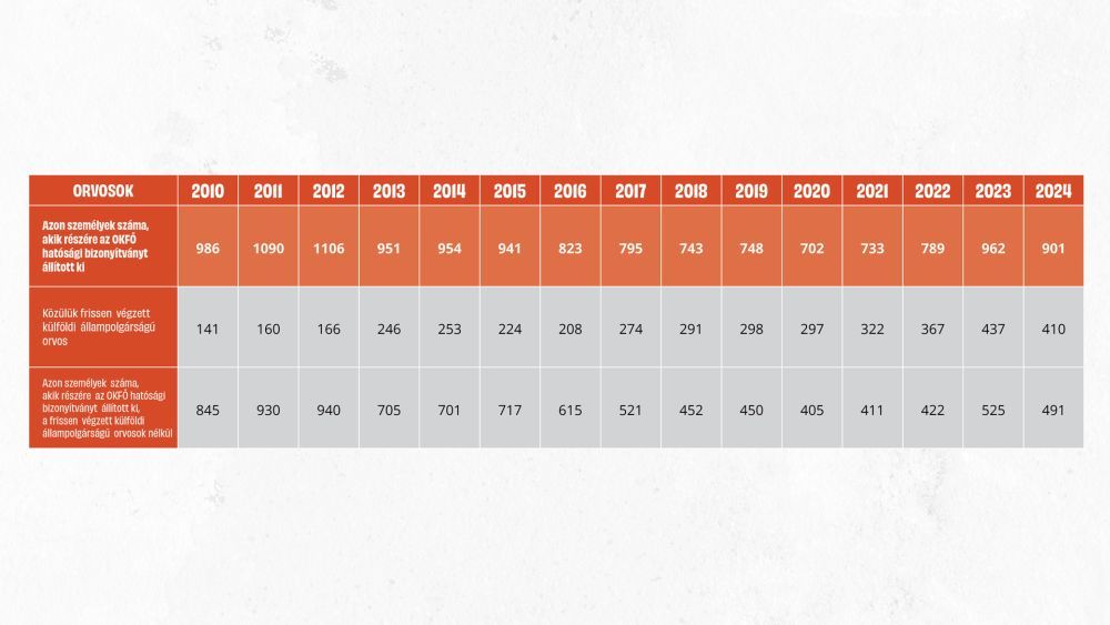 Ami a magyar orvosokat illeti: míg 2012-ben 940 fő magyar (és nem frissen végzett külföldi) állampolgárságú orvos kért hatósági bizonyítványt, addig 2024-ben ez a szám majdnem felére csökkent, összesen 491-re. Ezzel párhuzamosan a külföldön végzett és hazánkba érkezett orvosok létszáma 2012-ben 75 fő volt, 2024-ben 133 fő.