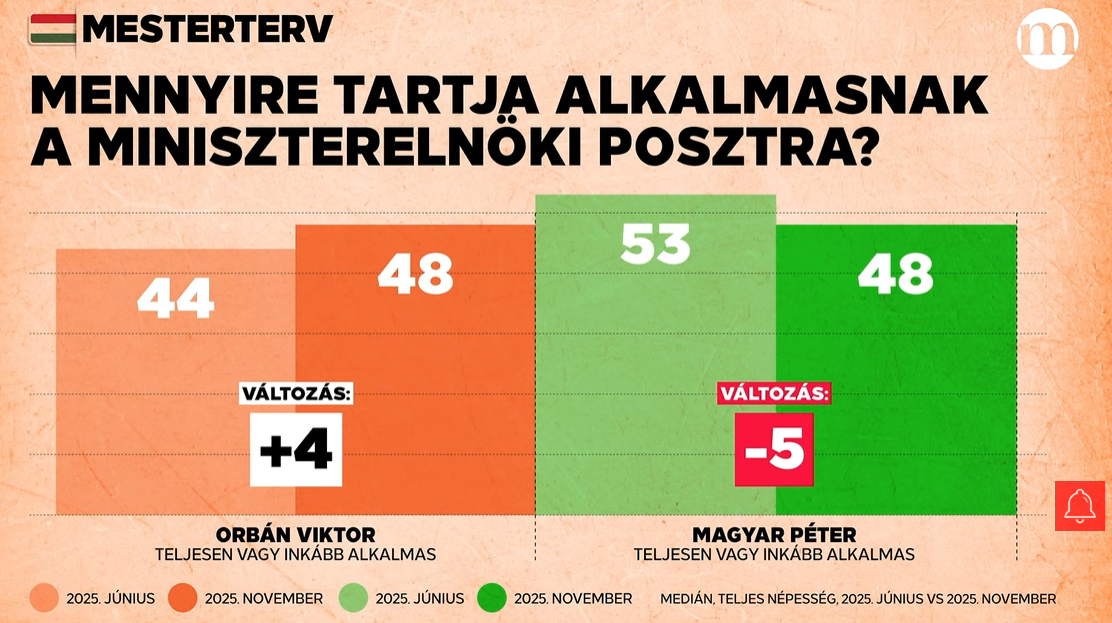 A Medián 2025 júniusában és novemberében mérte Magyar Péter, valamint Orbán Viktor megítélését annak kapcsán, hogy mennyire tartják alkalmasnak az ország vezetésére. Az adatokból az látszik, hogy Orbán Viktor négy százalékpontot erősödött, míg Magyar Péter öt százalékponttal visszaesett. Így a két vezető fej-fej mellett, negyvennyolc százalékon áll.