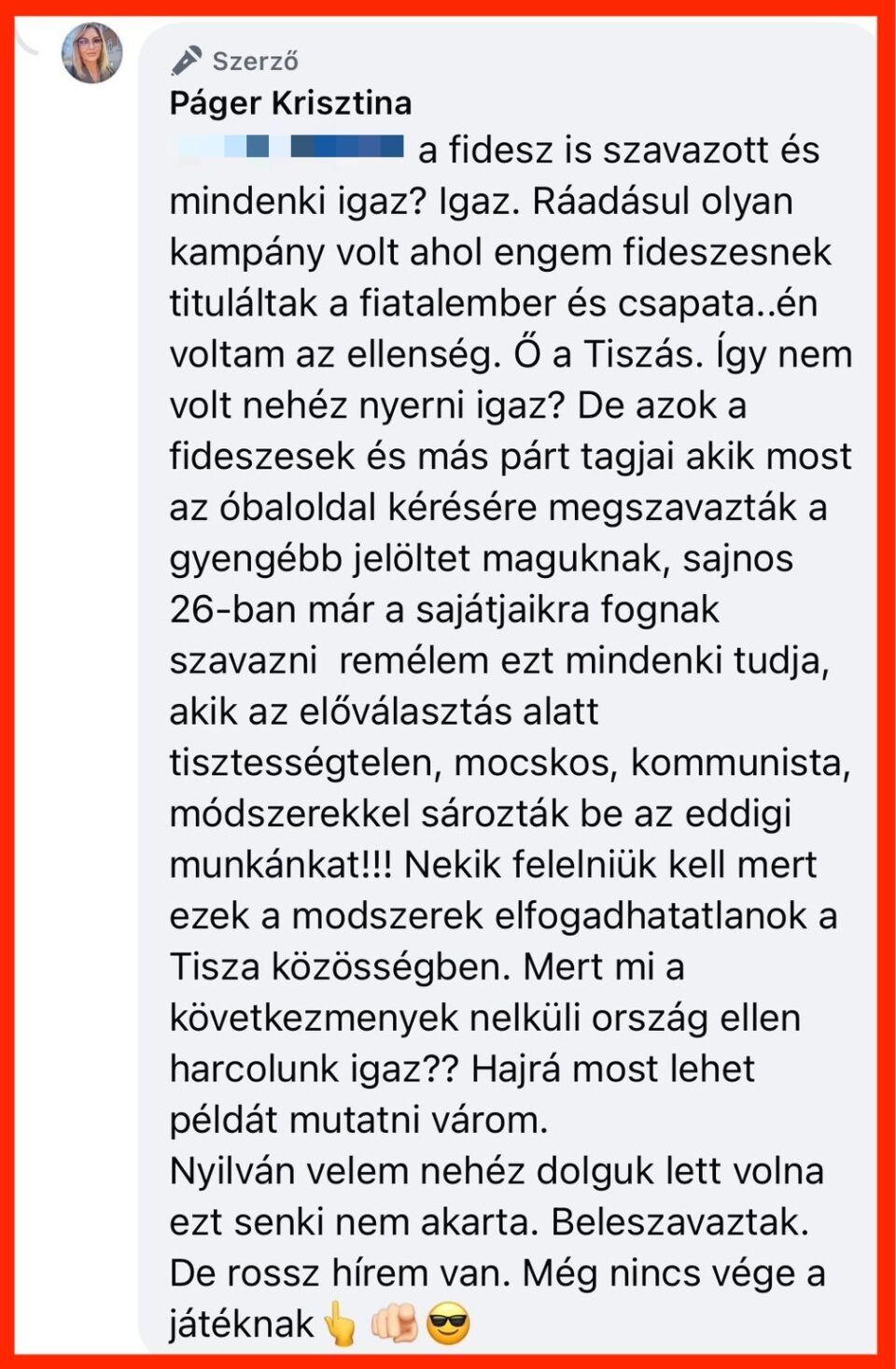 A Cs3.hu beszámolója szerint Páger egy erősen kritikus Facebook-kommentben vonta kétségbe az előválasztás tisztaságát.