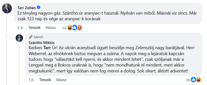 Tarr Zoltán megszólítva érezhette magát, mert kommentben ezzel reagált: „Szánthó úr aranywc-t használ. Nyilván van miből”. Szánthó Miklós sem maradt adós a válasszal: azt javasolta, Tarr