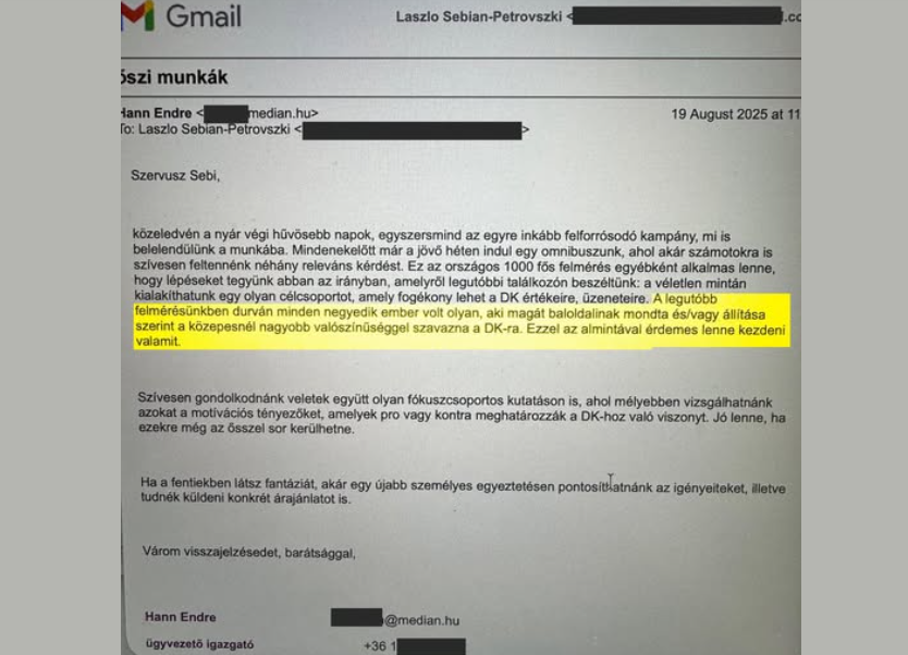 Molnár Csaba ezért egy részletet közölt a levelezésből, melyben a következők állnak: „Durván minden negyedik ember olyan, aki magát baloldalinak mondta, és/vagy állítása szerint a közepesnél nagyobb valószínűséggel szavazna a DK-ra. Ezzel az almintával érdemes lenne kezdeni valamit”.