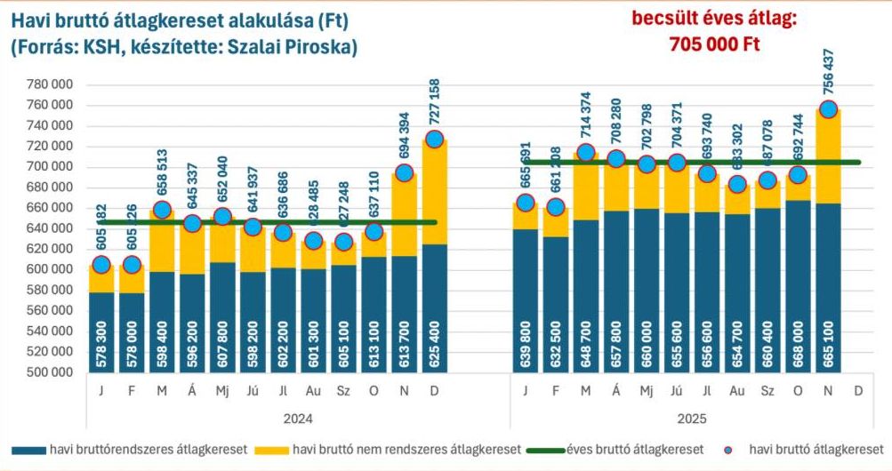 Novemberben a havi bruttó átlagkereset több, mint 756 ezer forint volt, ami 62 ezer forinttal több, mint 2024-ben. Bár novemberben és decemberben sok munkáltató éves bónuszt fizet, ami így erre a két hónapra jelentősen megdobja az átlagkeresetet – decemberre akár a 790 ezer forintot is elérheti az átlag –, 2026-ra az éves bruttó átlagkereset így is 700 ezer forint fölé emelkedik.