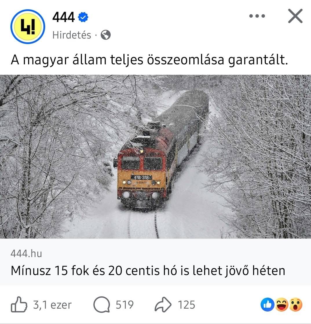Hozzáteszi: „Szépen hasznosulnak is a guruló eurók. A 444 elszántan hirdet a Facebookon. Például azt, hogy nagy hóesés lesz Magyarországon, »a magyar állam teljes összeomlása« pedig »garantált«. A hideg még itt van,