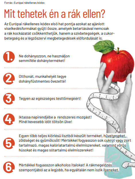Ebben segíti most a társadalmat az Európai rákellenes kódex, amely a rák kockázatát minimalizáló közegészségügyi ajánlásokat fogalmaz meg. A legfrissebb, immáron ötödik kiadás a betegség világnapján, február 4-én jelenik meg magyar nyelven. „Iránymutatást szeretnénk adni a társadalomnak, hogy mit tegyünk és mit ne azért, hogy távol tartsuk magunktól a betegséget” – hangsúlyozza Nagy Péter. Az Országos Onkológiai Intézet tudományos igazgatója egyike annak a hatvan európai szakértőnek, aki részt vett a kódex kidolgozásában.