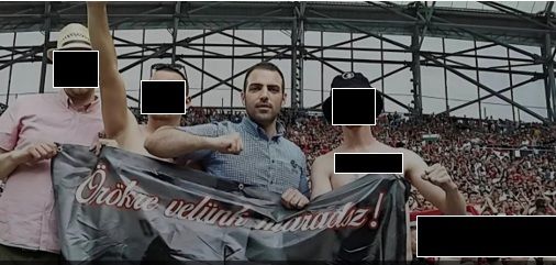 egy karját náci üdvözlésre lendítő illető társaságában szurkol – egy jellegzetes ingben.