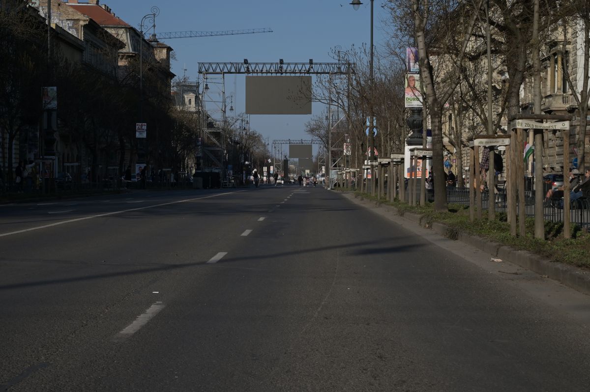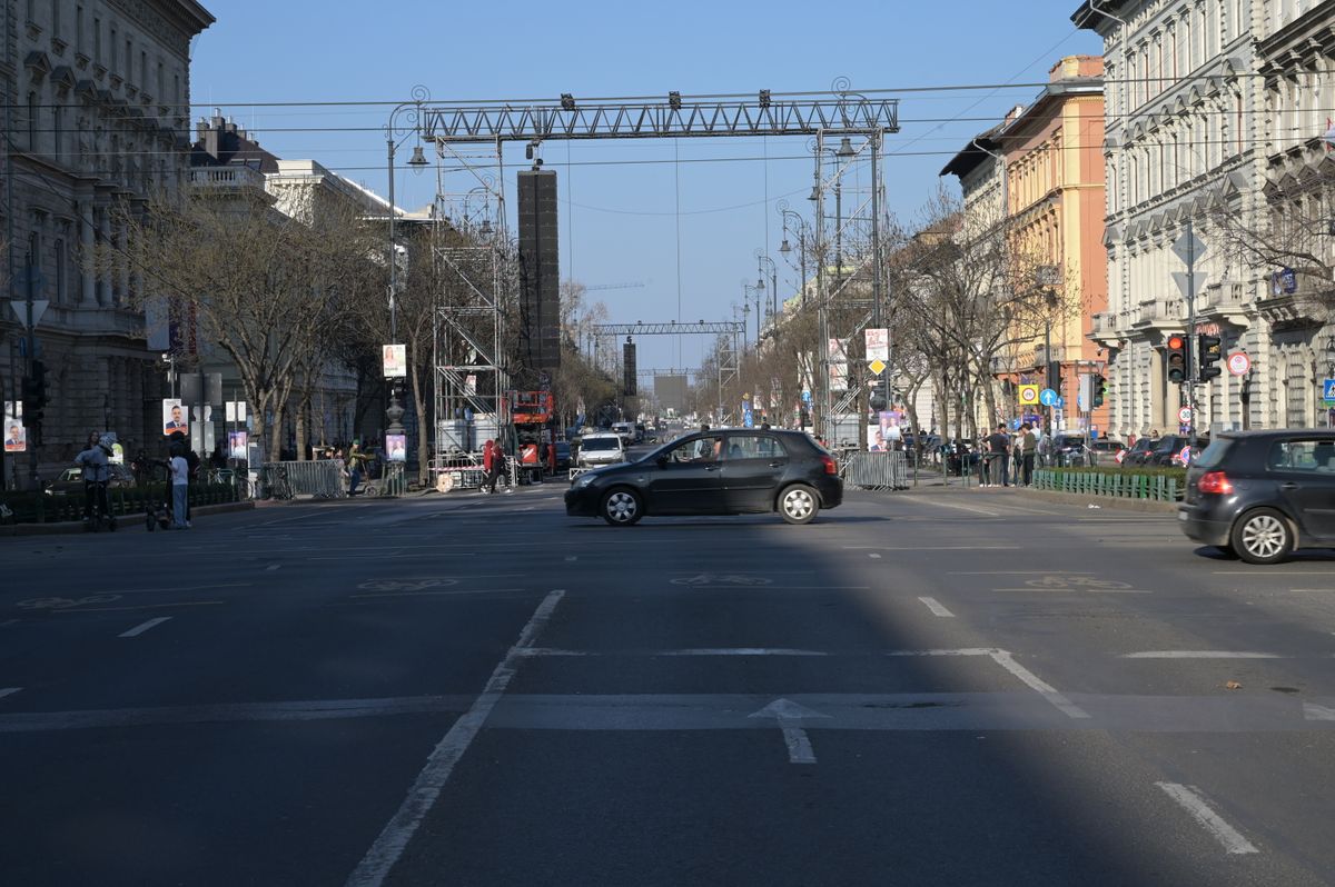 az Andrássy úton indokolatlanul sűrűn voltak kihelyezve az óriáskivetítők (LEDfalak) és a hangszórók,