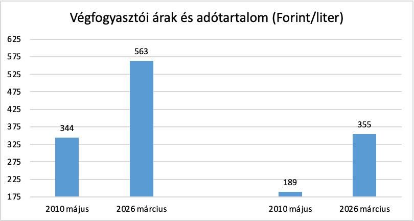 Apropó, fizetéshez viszonyított arány. A Kapitány István grafikonján szereplő benzinárakkal számolva 2010-ben a bruttó minimálbérből 213 liter benzint lehetett venni Magyarországon, ezzel szemben 2026-ban, Kapitány István Facebook-posztjának közzététele idején 573 litert lehetett (miközben a minimálbért keresők aránya eleve csökkent). Megjegyzendő, hogy 2022-ben az akkori minimálbérből 415 liter hatósági áras benzin jött ki, szemben a mai 573 literrel – érdekesség azoknak, akik szerint jó, jó, 2022-ig valóban előre mentünk, nem hátra, azóta viszont az egy helyben toporgás is szinte elérhetetlen vágyálom.
