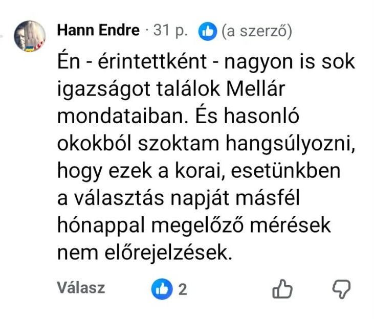 Én – érintettként – nagyon is sok igazságot találok Mellár mondataiban. És hasonló okokból szoktam hangsúlyozni, hogy ezek a korai, esetünkben a választás napját másfél hónappal megelőző mérések nem előrejelzések.”