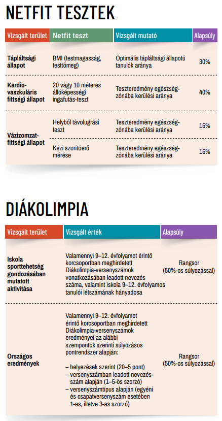 Az iskolai egészség- és diáksportmutató két összetevőből áll: a tanulók fittségi állapotára vonatkozó karakterisztikákból és az iskolák sporttehetség-gondozó aktivitását kifejező mutatóból. Az előbbinél a tápláltsági állapotot, a túlsúly, az elhízás arányát, a tanulók kardiovaszkuláris állapotát és a vázizomzatuk fittségét vizsgálták, az utóbbinál pedig az iskolák kiemelkedő sporteredményeit vették számba, így a diákolimpián nevezett tanulók számát, arányát, valamint az országos versenyeken elért 1–8. helyezéseket. A mutató kiszámolásánál a gimnáziumok összehasonlíthatósága végett kizárólag a 9–12. évfolyamos tanulók adatait vizsgálták.