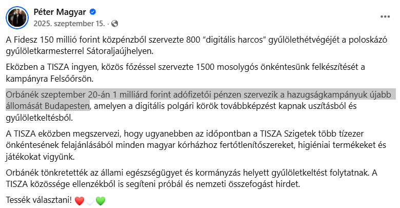 Magyar Péter már arra sem emlékszik, hogy mit hazudott ugyanerről a rendezvényről szeptemberben. Akkor azt írta a Tisza Párt elnöke, hogy 1 milliárd forintba fog kerülni, ehhez képest rakta ma ki a könnyen cáfolható kamudokumentumot a 390 millió forintról.