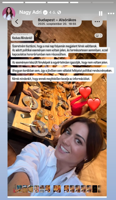 Nagy Adri szintén cáfolta, hogy ott lett volna a rendezvényen, közösségi oldalán azt írta „valótlanok a megjelent hírek”, nem volt ott a rendezvényen – ezt a képek is igazolják – és nem is részesült ezzel kapcsolatban semmilyen honoráriumban. Leszögezte: sosem vállalt és nem is fog fellépést vállalni politikai rendezvényen.
