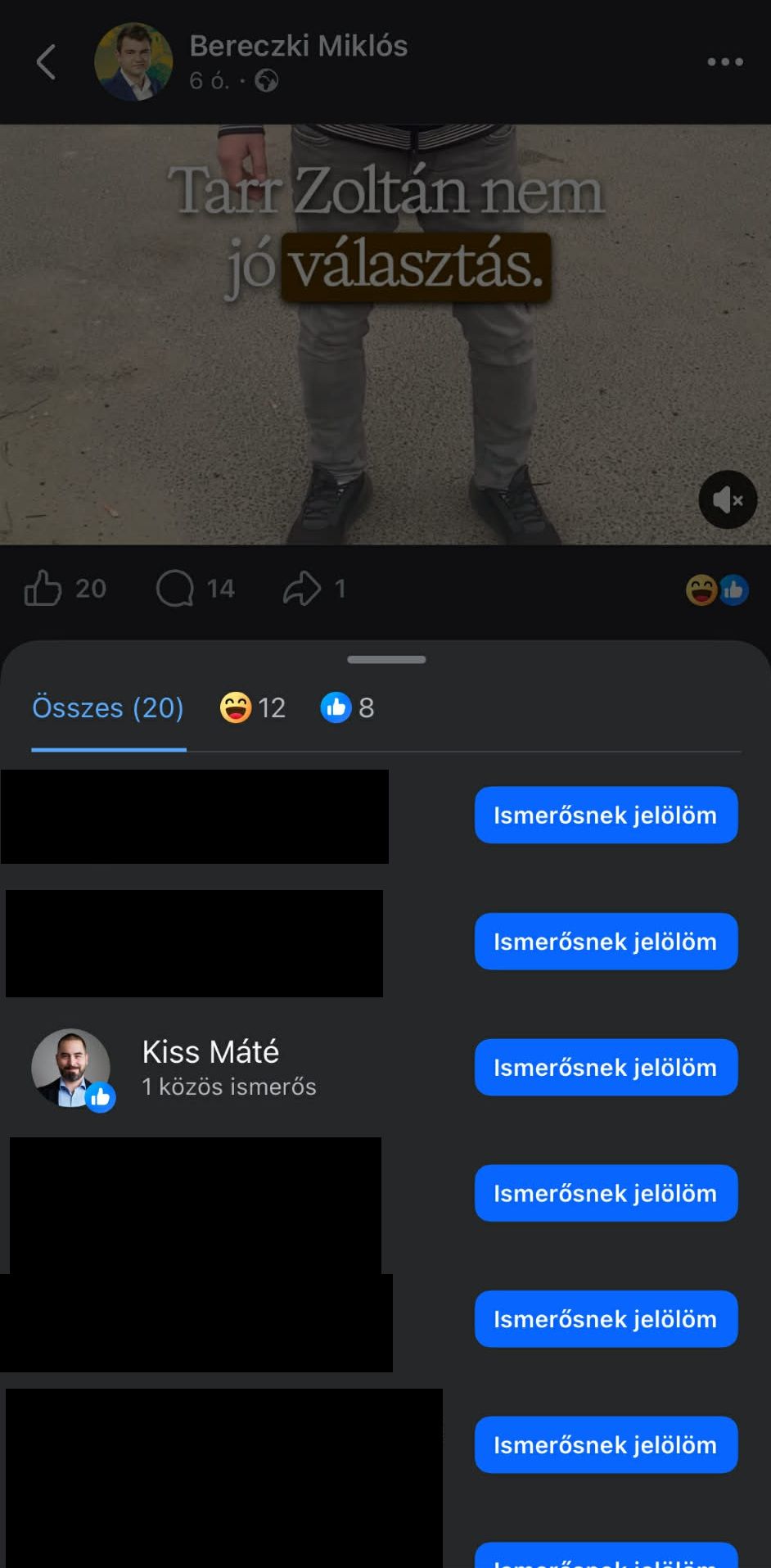 És Bereczki Miklós szóban forgó bejegyzését ki lájkolta? Igen, Kiss Máté, a Tisza Párt korábbi képviselőjelölt-jelöltje. Mint ismert, a Tisza Párt november közepén egy többfordulós előválasztást tartott, hogy a végén kijelöljék, melyik választókerületbe ki is induljon majd a párt színeiben. Budapest 16-ban a három jelölt között volt a végső győztes Tarr Zoltán, dr. Kiss Máté jogász, közbeszerzési szakértő és önkormányzati tanácsadó és Tóth Norbert sportlétesítmény-menedzser. Az első forduló végén Tóth Norbert lett az, aki nem folytathatta a versenyt.