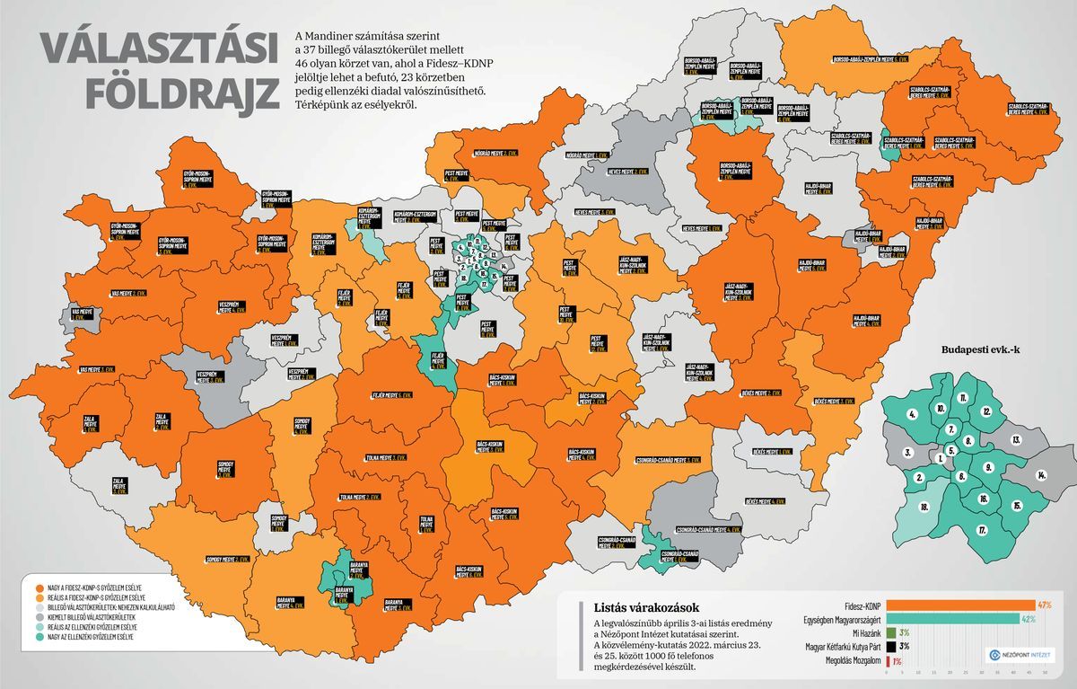 Ez volt a menet a korábbi országgyűlési választásokkor is és ez megy idén is: a miniszterelnök napi szinten – beleértve a hétvégéket is – járja a vidéket, Kaposvár, Eger, Szentendre, Miskolc, Dunaújváros, Hódmezővásárhely után Kecskemét, Nagykanizsa, Esztergom, Törökszentmiklós, Veszprém, Győr, Pécel és Békéscsaba volt terítéken. Ezen választókerületek többsége négy éve is billegő volt. A Mandiner 2022-es választási különszámában a négy évvel ezelőtti esélyeket a Nézőpont Intézet segítségével komplex módszerrel becsültük meg: helyi felmérésekkel, az országos kutatási eredmények és egyéni körzeti választástörténeti adatok összevetésével, valamint a 2018-as választókerületi eredmények újraszámolásával a megváltozott pártrendszer alapján.
