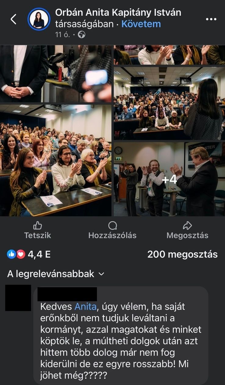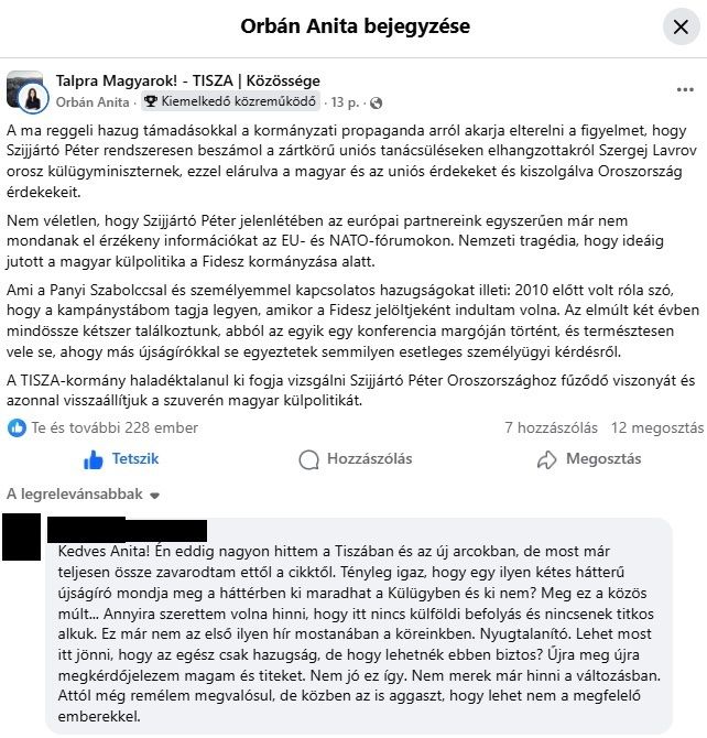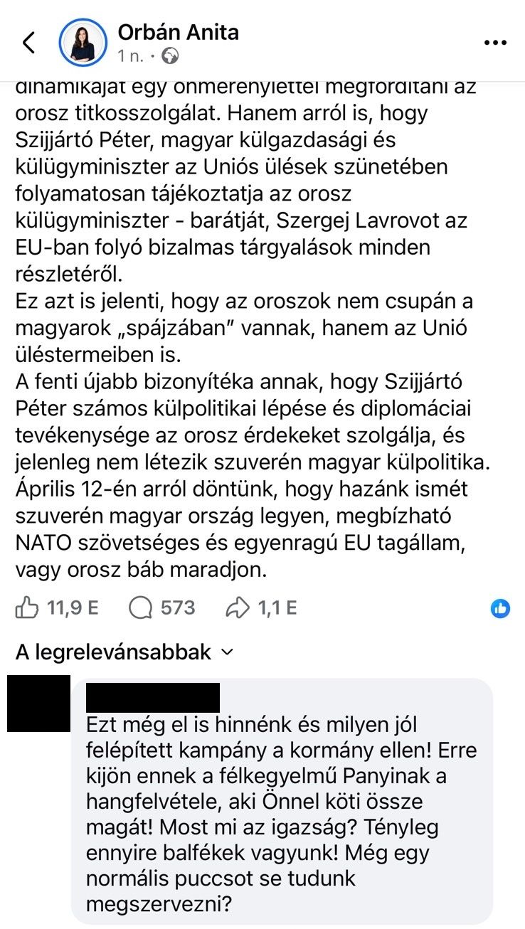 Az eset remekül bizonyítja, hogy egy komoly titkosszolgálati akció zajlik Magyarország külügyminisztere, Szijjártó Péter ellen, a Tisza Párt viselkedése és az egész tiszás ügynökbotrány pedig éket vert a Tisza-táboron belül. Orbán Anita, Kapitány István és Magyar Péter posztjai alatt záporoznak azok a hozzászólások, az emberek nem értik, hogyan történhetett meg mindez.