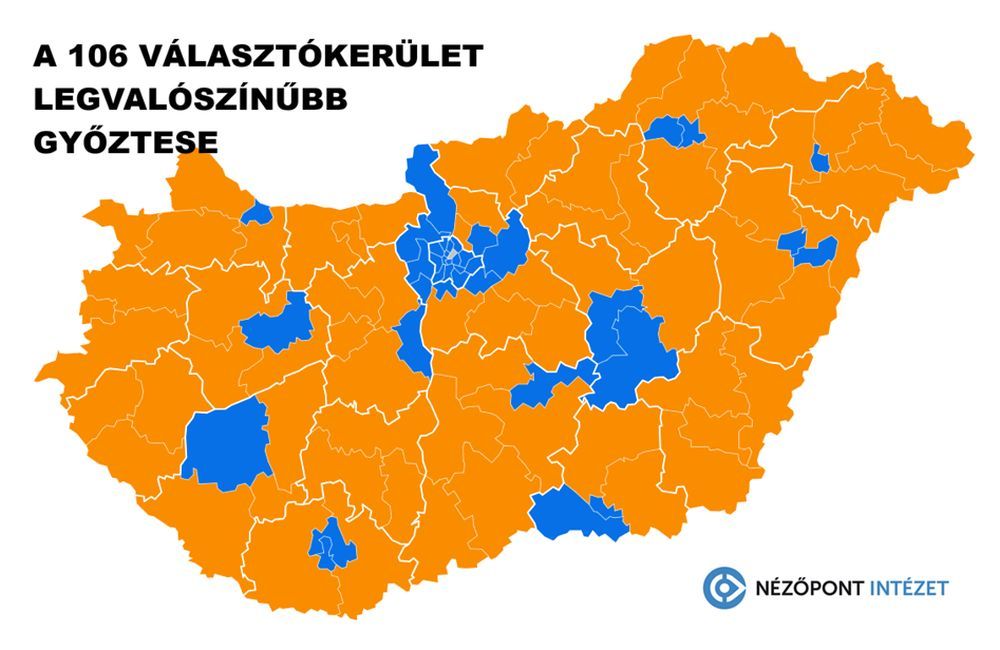 106 választókerületből 66-ban nagy valószínűséggel Fidesz-győzelem várható a Nézőpont Intézet mandátumbecslési projektjének előrejelzése szerint.