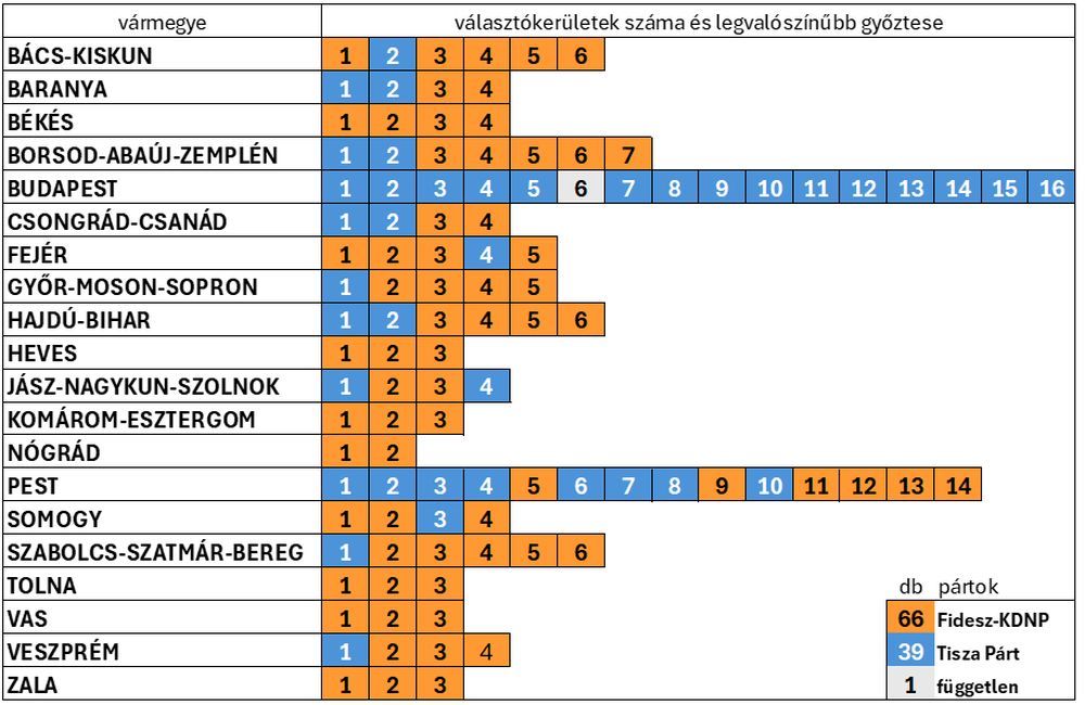 Mivel a Fidesz támogatottsága vidéken, a Tisza Párté a városokban erősebb, nem meglepő, hogy a kormánypártok jelöltjei elsősorban a kisvárosias és községek által dominált választókerületekben diadalmaskodhatnak – hangsúlyozzák. Ezzel szemben Miskolcon, Debrecenben, Szegeden, Pécsett vagy Nyíregyháza és Győr egyes részein a Tisza Párt jelöltjei esélyesebbek.