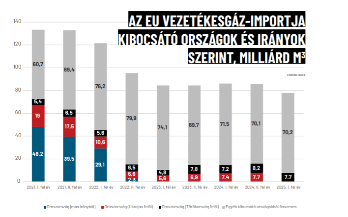 Az energiaválság éves szinten akár 2,5 százalékkal is megnövelheti az orosz GDP-t, az Európai Unióba érkező, Magyarország és Szlovákia által megvásárolt földgáz viszont mindössze 0,3 százalékos hozzájárulást jelent – derül ki az IEEFA adatsorából. E szerint 2024-ben, amikor még Ukrajna felől is érkezett orosz földgáz, 10,1 milliárd euróba került a csővezetékes beszerzés. Tavaly az első fél évben mindössze 3 milliárd eurót tett ki az importköltség. Az EU-ba csövön továbbított földgázmennyiség mindössze 10 százaléka érkezett 2025-ben Oroszországból, az arány az orosz–ukrán háború előtt, 2021-ben még 50 százalék körül volt. Az unió legnagyobb vezetékesföldgáz-szállítója Norvégia közel 43 százalékos aránnyal, a második Algéria 20 százalék körüli részesedéssel, majd pedig az Egyesült Királyság következik évről évre csökkenő mennyiséggel.