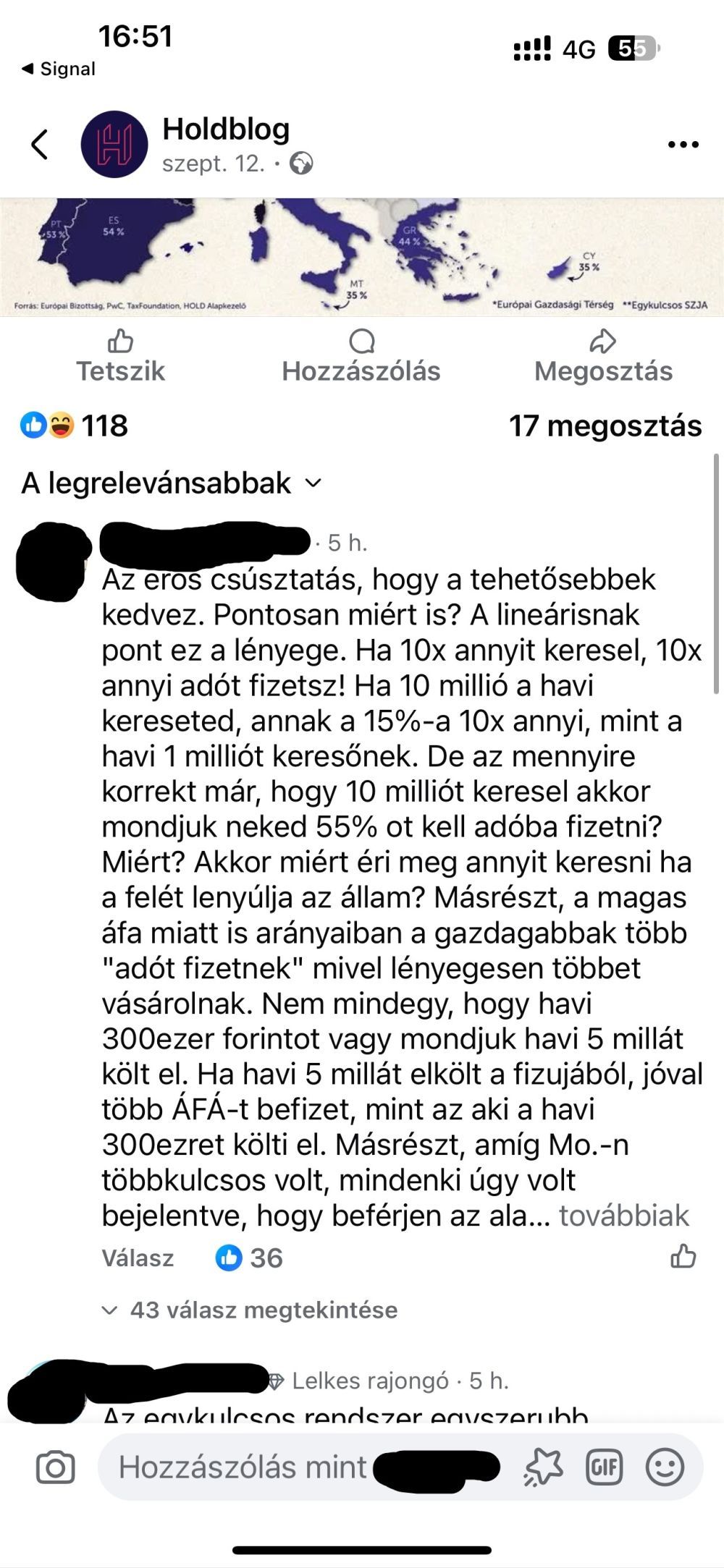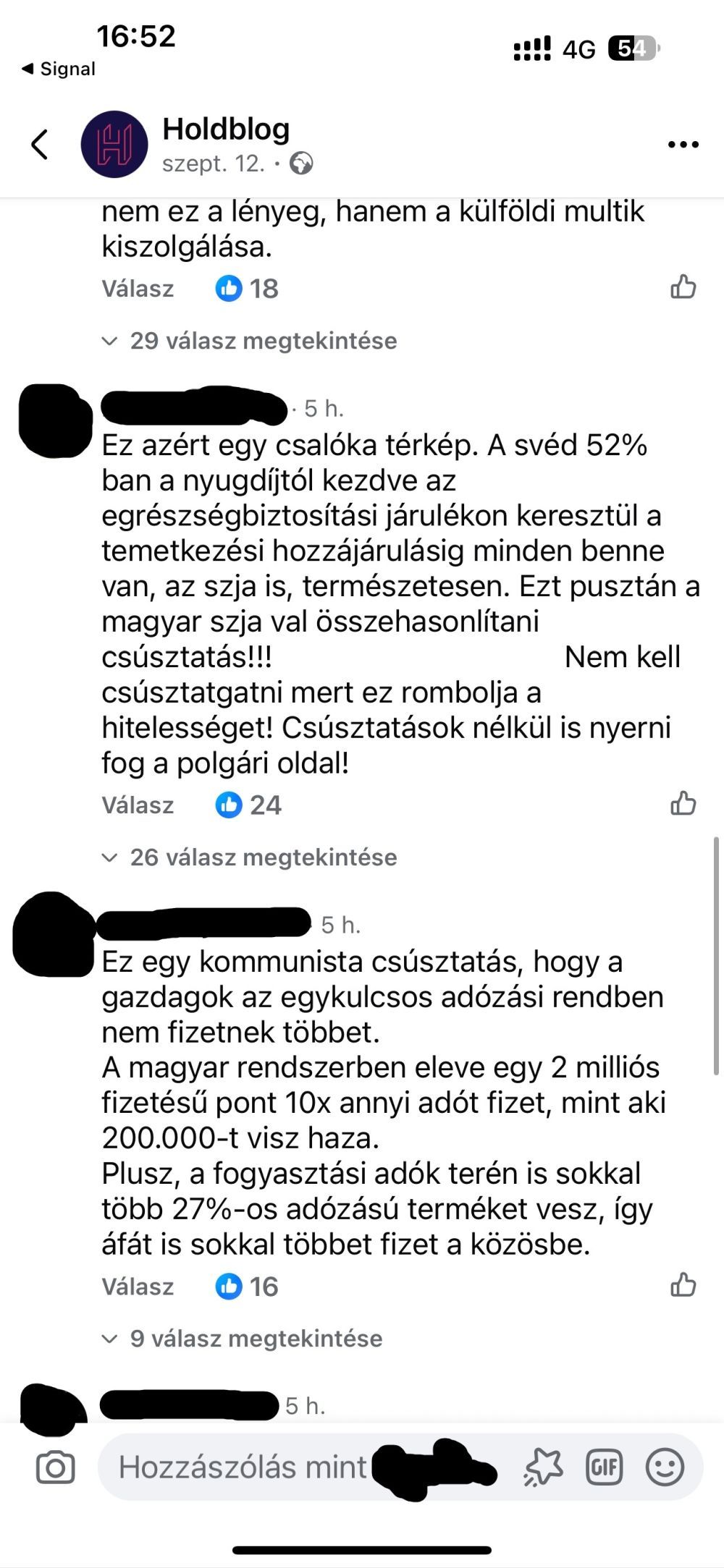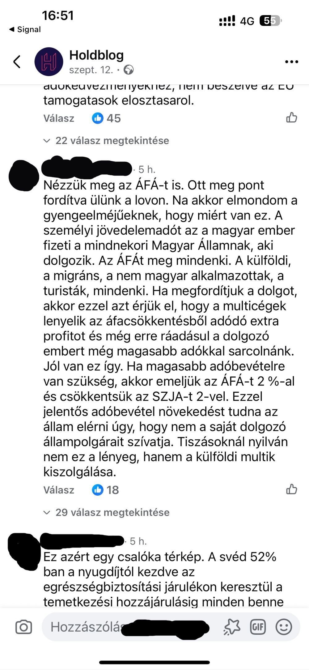 Megint másik: „Nézzük meg az ÁFÁ-t is. Ott meg pont fordítva ülünk a lovon. Na akkor elmondom a gyengeelméjűeknek, hogy miért van ez. A személyi jövedelemadót az a magyar ember fizeti a mindnekori Magyar Államnak, aki dolgozik. Az ÁFÁt meg mindenki. A külföldi, a migráns, a nem magyar alkalmazottak, a turisták, mindenki. Ha megfordítjuk a dolgot, akkor ezzel azt érjük el, hogy a multicégek lenyelik az áfacsökkentésből adódó extra profitot és még erre ráadásul a dolgozó embert még magasabb adókkal sarcolnánk. Jól van ez így. Ha magasabb adóbevételre van szükség, akkor emeljük az ÁFÁ-t 2 %-al és csökkentsük az SZJA-t 2-vel. Ezzel jelentős adóbevétel növekedést tudna az állam elérni úgy, hogy nem a saját dolgozó állampolgárait szívatja. Tiszásoknál nyilván nem ez a lényeg, hanem a külföldi multik kiszolgálása”.