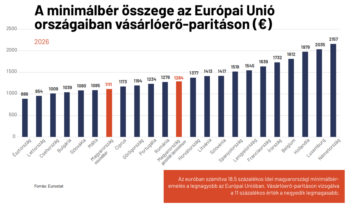 Uniós összevetésben Magyarországon kevés a minimálbérért dolgozó alkalmazott. A magyar legkisebb munkabér továbbra is Európa sereghajtói közé tartozik, viszont ebben a statisztikában nincs benne a bérminimum, amelynek összege már az uniós középmezőnyben van.