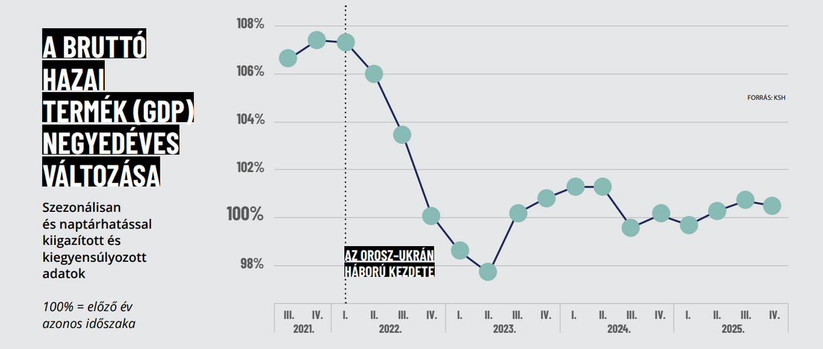A magyar gazdaság 2022 elejére éppen ki tudott lábalni a koronavírus-járvány okozta sokkból, és a GDP negyedéves alapon felfelé kezdett ívelni. 2022 harmadik negyedévében még 4 százalékkal növekedett a bruttó hazai termék, utána viszont zuhanórepülés jött: négy negyedéven keresztül nemhogy nőtt, inkább csökkent a gazdaság teljesítménye. Ebből a spirálból pedig azóta sem sikerült kitörni: az előző két negyedévben is mindössze 0,6, illetve 0,7 százalékos volt a Központi Statisztikai Hivatal adatai szerint a GDP-növekedés az előző évhez képest.