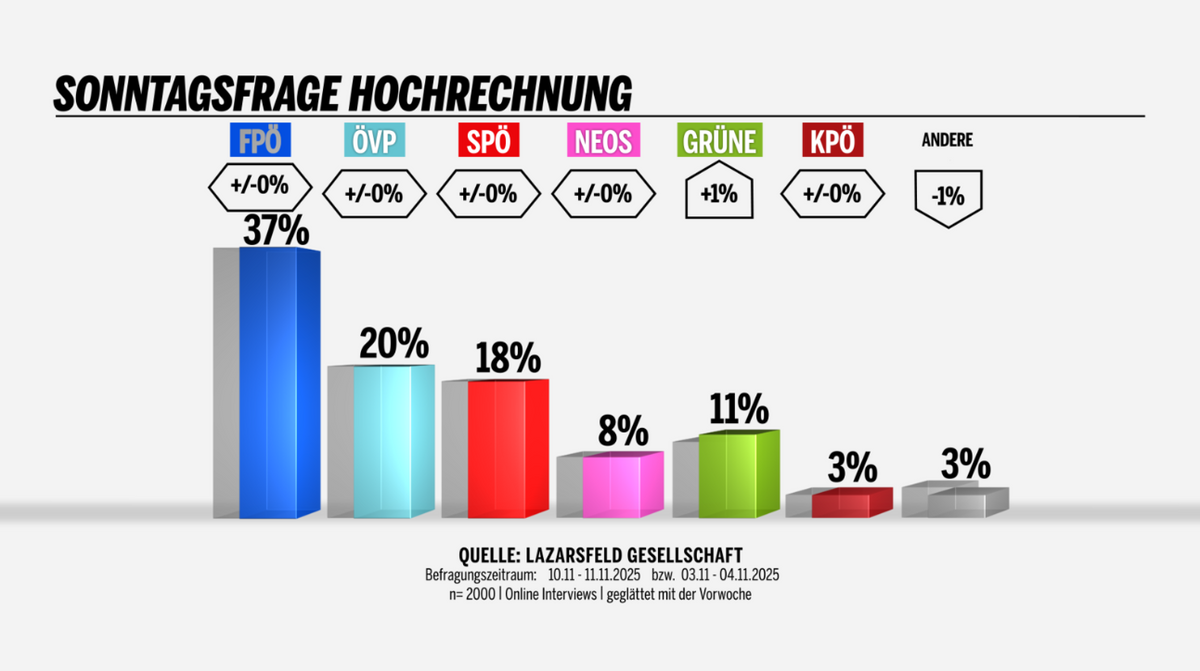A pártok támogatottsági veresenyét továbbra is az FPÖ vezeti 37 százalékos eredménnyel. Az ÖVP 20 százalékon áll. A szintén kormánypárti SPÖ és a NEOS is inkább gyengén teljesít a politikai őszben, 18, illetve 8 százalékkal.