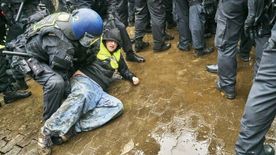 Az újságírókat a maszkos aktivisták végül a közelben álló rendőrcsoportig üldözték, ahol az egyenruhások útját állták az erőszakoskodóknak.