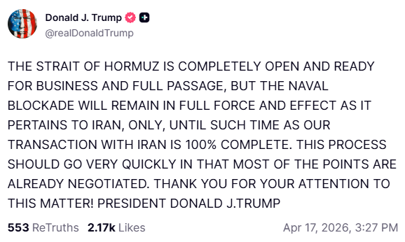 Az elnök egy további bejegyzésében ugyanakkor hangsúlyozta, hogy az iráni kikötőkre vonatkozó amerikai katonai blokád továbbra is érvényben marad, és egészen addig tart, amíg az Egyesült Államok teljes megállapodást nem köt Iránnal. Megjegyezte, hogy a folyamat nagyon gyorsan haladhat, mert a megállapodás tartalmának legtöbb pontjáról már egyezség született.
