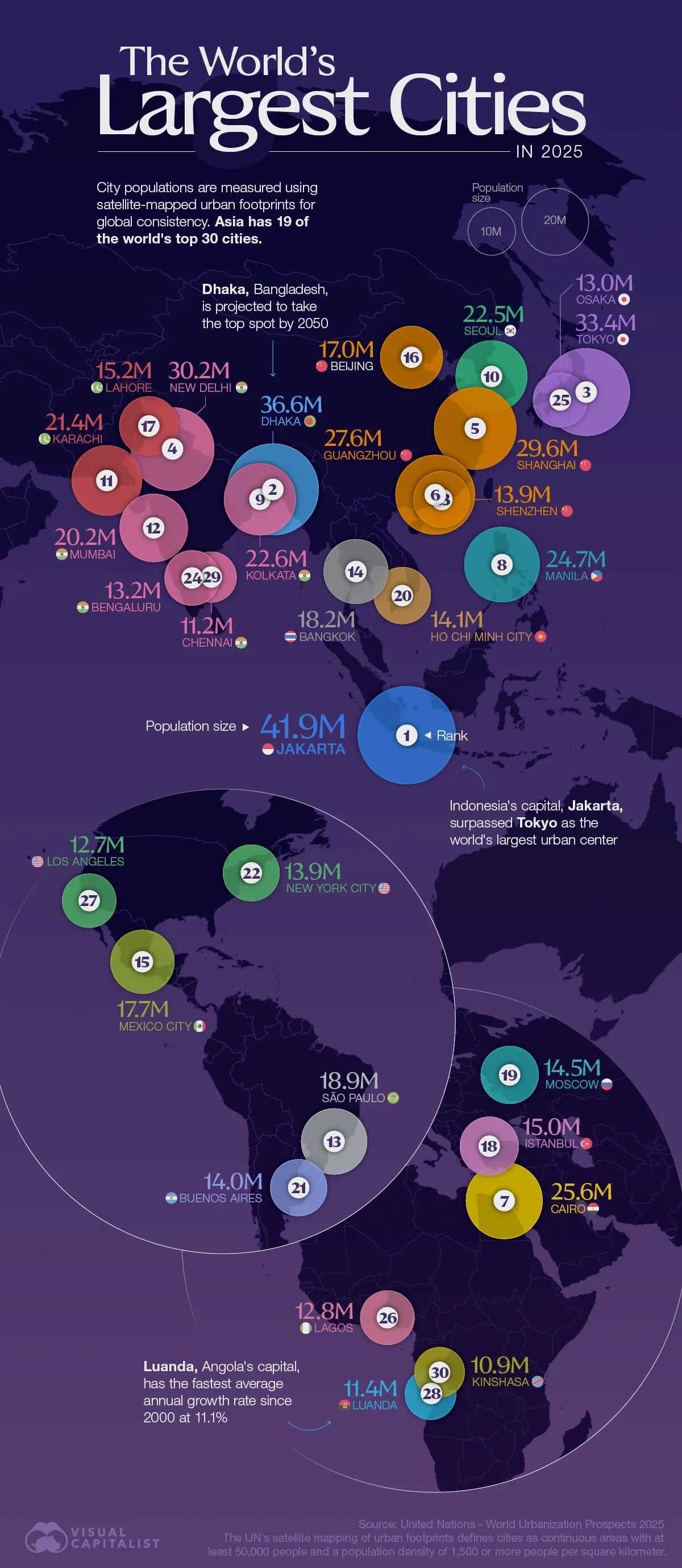 A globális urbanizáció súlypontja egyértelműen Ázsiába tevődött át, de a dinamika – vagyis a városi növekedés iránya és sebessége – már nem kizárólag ott dől el. A világ legnagyobb települései népesség szerint továbbra is ázsiai megapoliszok: Jakarta, Dakka és Tokió található az élmezőnyben, messze lehagyva minden más térséget. Jakarta közel 42 milliós lakosságával 2025-ben a föld legnépesebb városának számított, közvetlenül mögötte állt Dakka 36,6, majd Tokió 33,4 millióval. Ez jól jelzi, hogy a klasszikus „nyugati világváros” fogalma demográfiai értelemben végleg elveszítette vezető szerepét.
