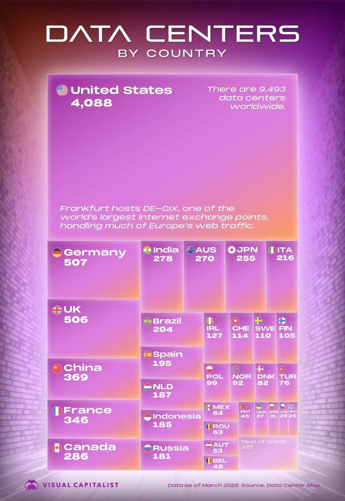 A márciusi adatok alapján a globális adatközpont-infrastruktúra igen extrém módon oszlik meg: az Egyesült Államok 4088 létesítménnyel a világ kapacitásának 43 százalékát birtokolja. Ez több mint nyolcszor annyit, mint a második helyezett Németországé, amelynek 507 adatközpontja van, míg az Egyesült Királyság fej fej mellett halad vele 506 egységgel. A harmadik hely környékén már egy törés látszik: Kína következik 369 létesítménnyel, majd Franciaország 346-tal.
