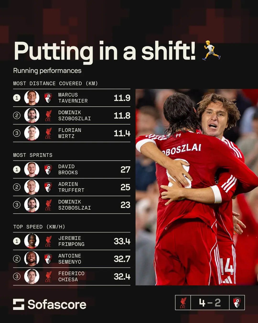 a tavaly még űrformában játszó Mohamed Szalah, valamint a középpálya másik melósa, Ryan Gravenberch és a már említett Van Dijk mellett. S ha ez érvényes volt legutóbb, hát még inkább érvényes a mostani évadban: Szoboszlai már rögtön az első játéknapon, a Bournemouth elleni emlékezetes bajnoki nyitány során alulról súrolta a 12 km-t – 23 sprintje ugyancsak top 3-as mezőnyszinten –, és ez mindennaposnak tekinthető tőle (ugyanezt gond nélkül megcsinálta a Bajnokok Ligájában is az Atlético Madrid ellen).