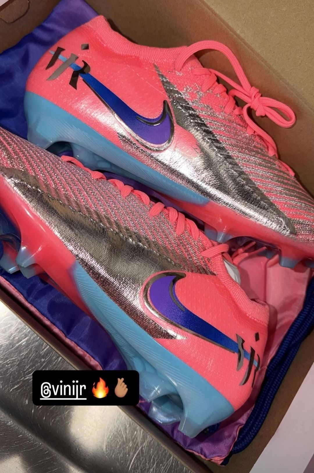 Szoboszlai Dominik, a Liverpool futbalistája Instagram-történetében egy dobozból frissen kivett, feltűnő rózsaszín–ezüst–kék árnyalatú futballcipő osztott meg. A magyar labdarúgó-válogatott csapatkapitánya a bejegyzésben megjelölte Vinícius Júniort, a Real Madrid szélsőjét is.