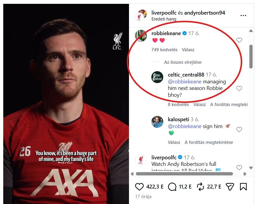Az ír szakember két piros szívet tett ahhoz a videóhoz, amelyben Robertson bejelentette a döntését, és a hozzászólását már több mint 700-an lájkolták. Az egyik szurkoló a kommentre reagálva megkérdezte Keane-től, hogy a következő idénytől együtt dolgozik-e majd a skót futballistával a Celticnél, de erre (természetesen) nem kapott választ.